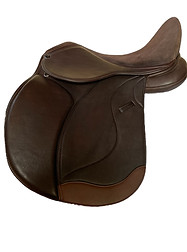 Apelles Pro shock V-jump saddle, dark brown with beige piping. Large kneerolls
